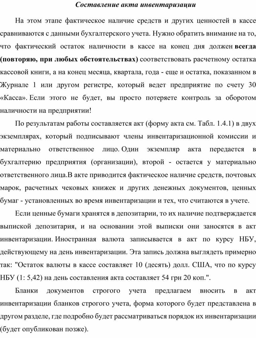 По результатам работы составляется акт (форму акта см. Табл. 1.4.1) в двух экземплярах, который подписывают члены инвентаризационной комиссии и материально ответственное лицо. Один экземпляр акта передается в бухгалтерию предприятия (организации), второй - остается у материально ответственного лица.В акте приводится фактическое наличие средств, почтовых марок, расчетных чековых книжек и других денежных документов, ценных бумаг - установленных во время инвентаризации и тех, что считаются в учете.