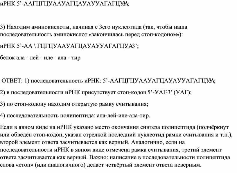 Если в явном виде на иРНК указано место окончания синтеза полипептида (подчёркнут или обведён стоп-кодон, указан стрелкой последний нуклеотид рамки считывания и т.п.), второй элемент ответа засчитывается как верный. Аналогично, если на последовательности иРНК в явном виде отмечена рамка считывания, третий элемент ответа засчитывается как верный. Важно: написание в последовательности полипептида слова «стоп» (или аналогичного) делает четвёртый элемент ответа неверным.