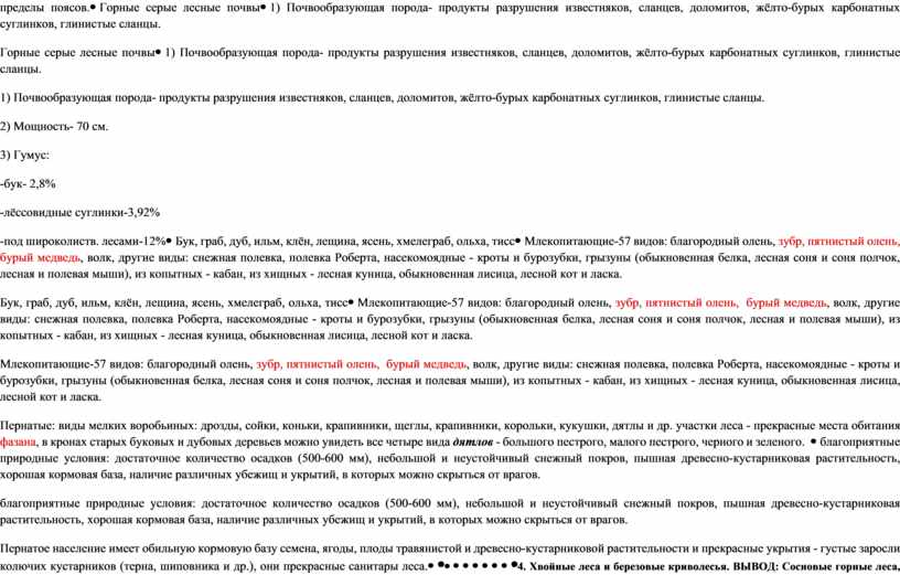 1) Почвообразующая порода- сильнощебнистые с малым слоем суглинков. 2) Мощность-20-100см. (60-90 см-бер. криволесье) 3) Гумус-8,07-9,3% (до 18, 7%) |