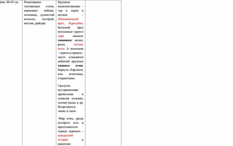 Крупные млекопитающие - тур и серна и мелкие - обыкновенный крот, бурозубка. Большой вред поголовью туров и серн наносят хищники: волки, рыси, лесные коты. А молодняк - турята и сернята - часто становятся добычей крупных хищных птиц: беркута, бородача, или ягнятника, стервятника. Грызуны: кустарниковая, прометеева и снежная полевки, лесная мышь и др. Встречаются также и змеи. Мир птиц, среди которого есть и представители отряда куриных - кавказский тетерев и каменная куропатка, или кеклик. |