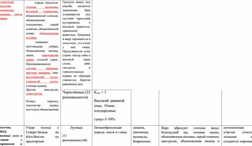 Грызуны живут под землёй, питаются зерновыми, Заяц устраивается под густыми зарослями кустарников, в высоком травостое- травоядное животное. Хищники в жару скрываются в лесостепи , а в степи у них пища. Представители птиц строят гнёзда либо в высокой траве степи, либо гнездятся в горизонтальных норках по обрывам глинистых берегов равнинных рек. |