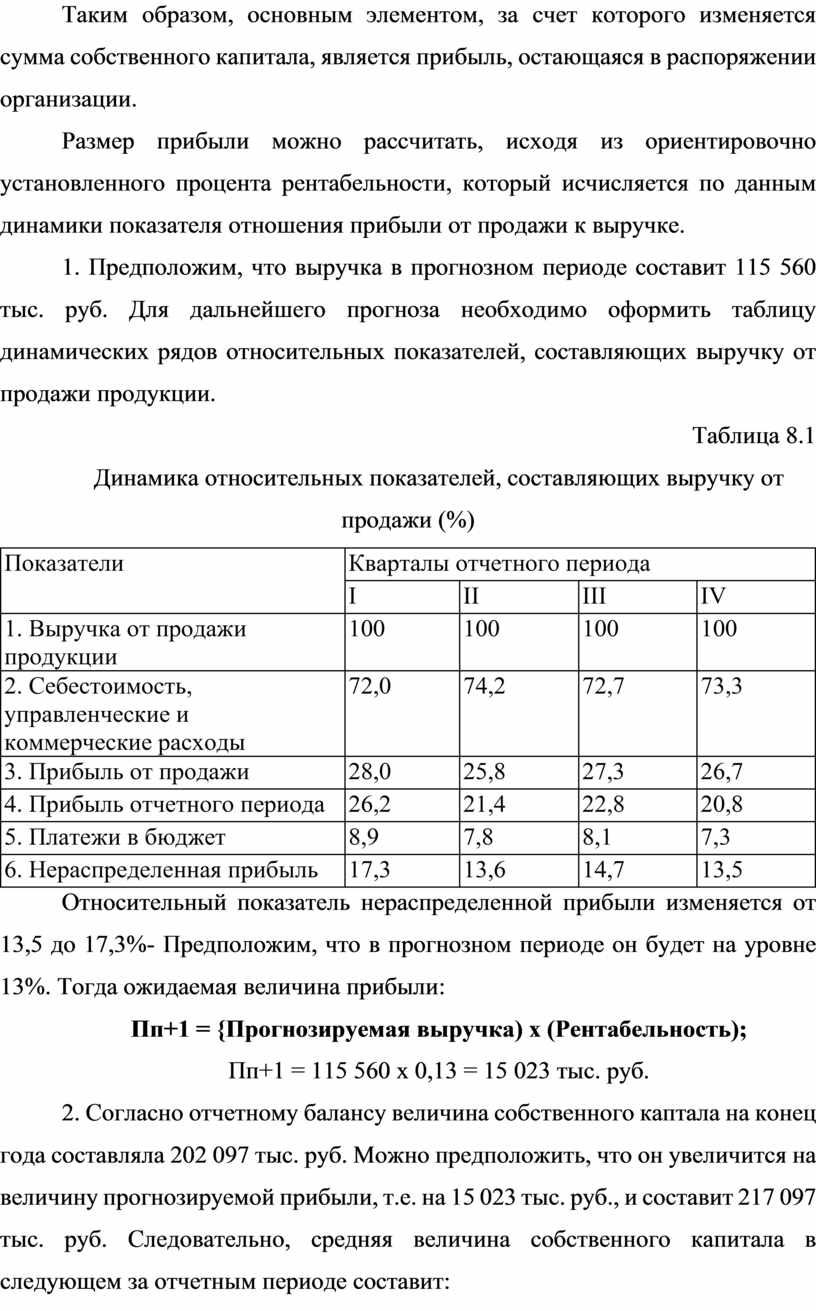 Относительный показатель нераспределенной прибыли изменяется от 13,5 до 17,3%- Предположим, что в прогнозном периоде он будет на уровне 13%. Тогда ожидаемая величина прибыли: