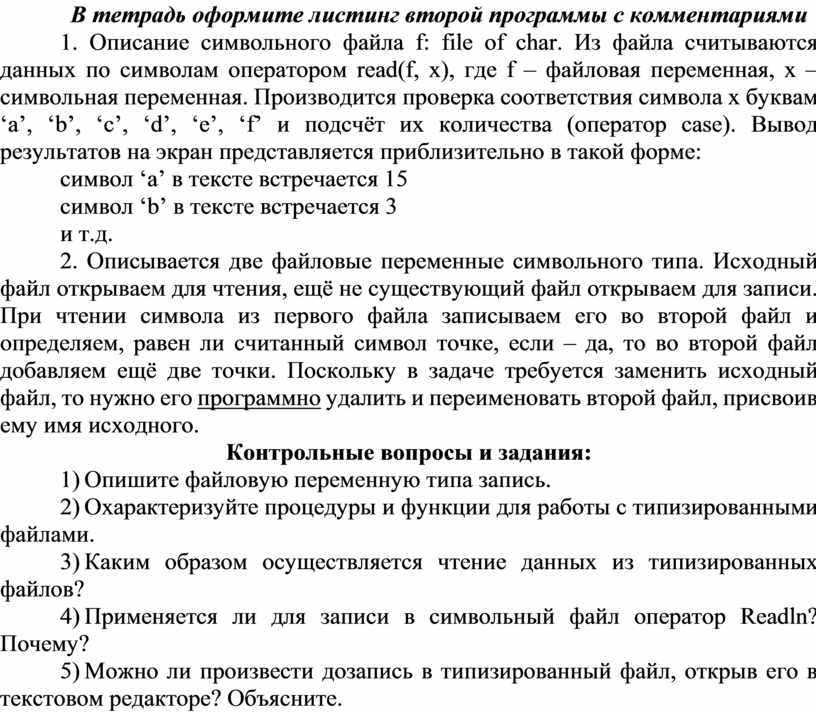 1. Описание символьного файла f: file of char. Из файла считываются данных по символам оператором read(f, x), где f – файловая переменная, x – символьная переменная. Производится проверка соответствия символа x буквам ‘a’, ‘b’, ‘c’, ‘d’, ‘e’, ‘f’ и подсчёт их количества (оператор case). Вывод результатов на экран представляется приблизительно в такой форме: