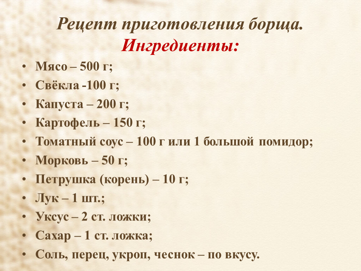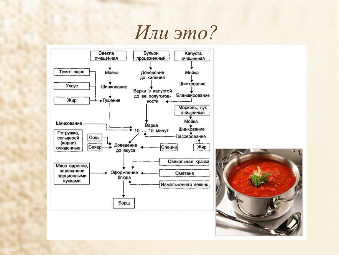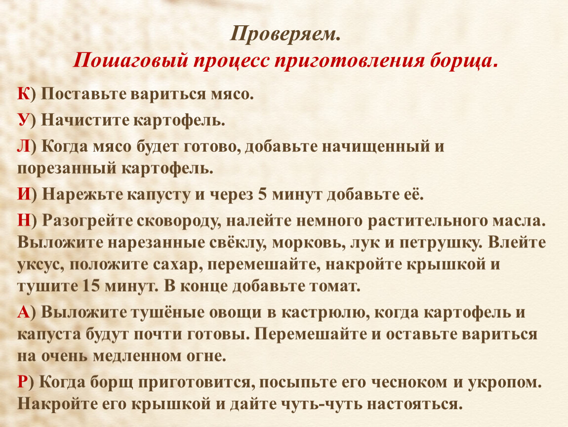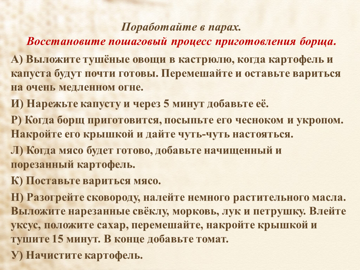 Поработайте в парах. Восстановите пошаговый процесс приготовления борща.