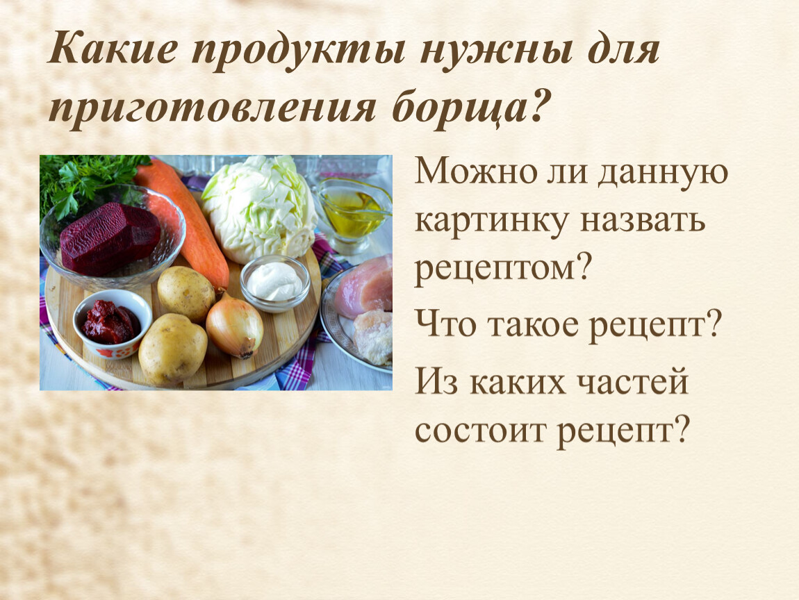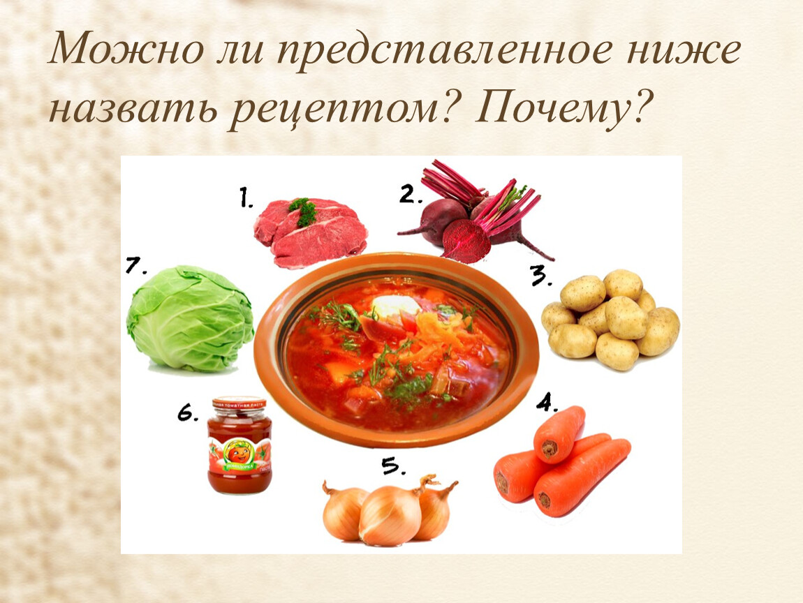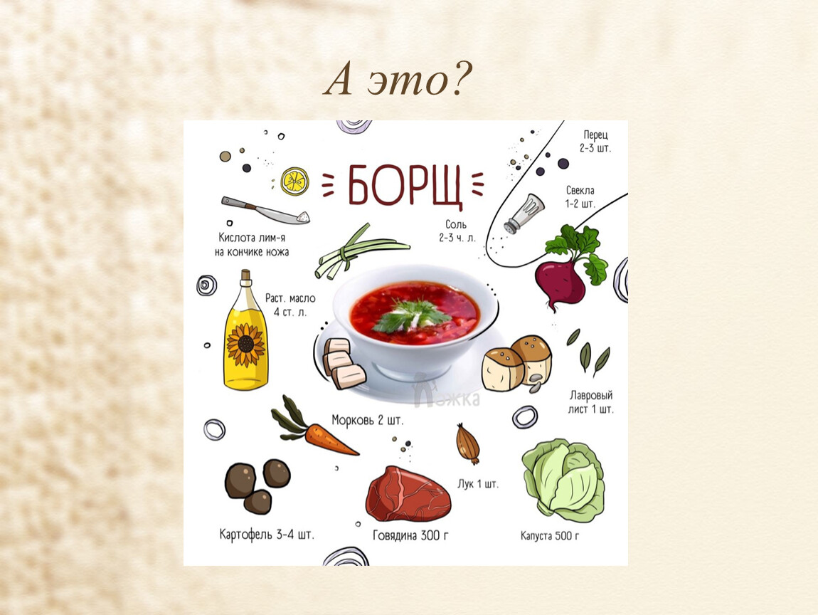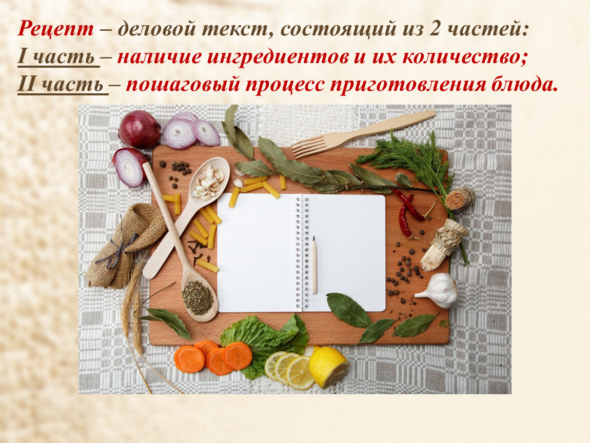 Рецепт – деловой текст, состоящий из 2 частей:I часть – наличие ингредиентов и их количество;II часть – пошаговый процесс приготовления блюда.
