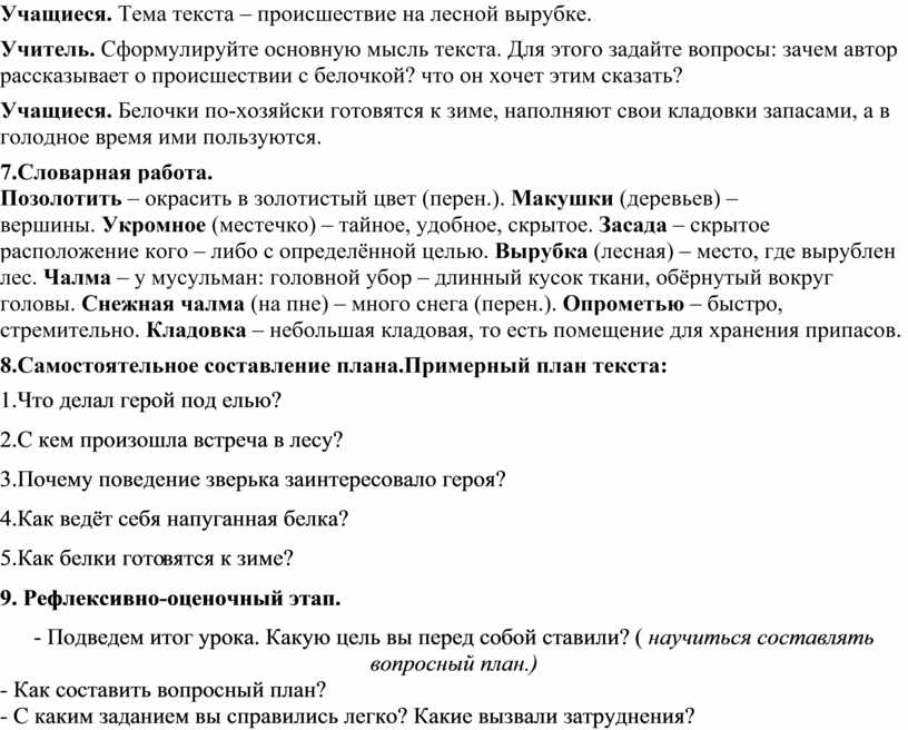 Учитель. Сформулируйте основную мысль текста. Для этого задайте вопросы: зачем автор рассказывает о происшествии с белочкой? что он хочет этим сказать?