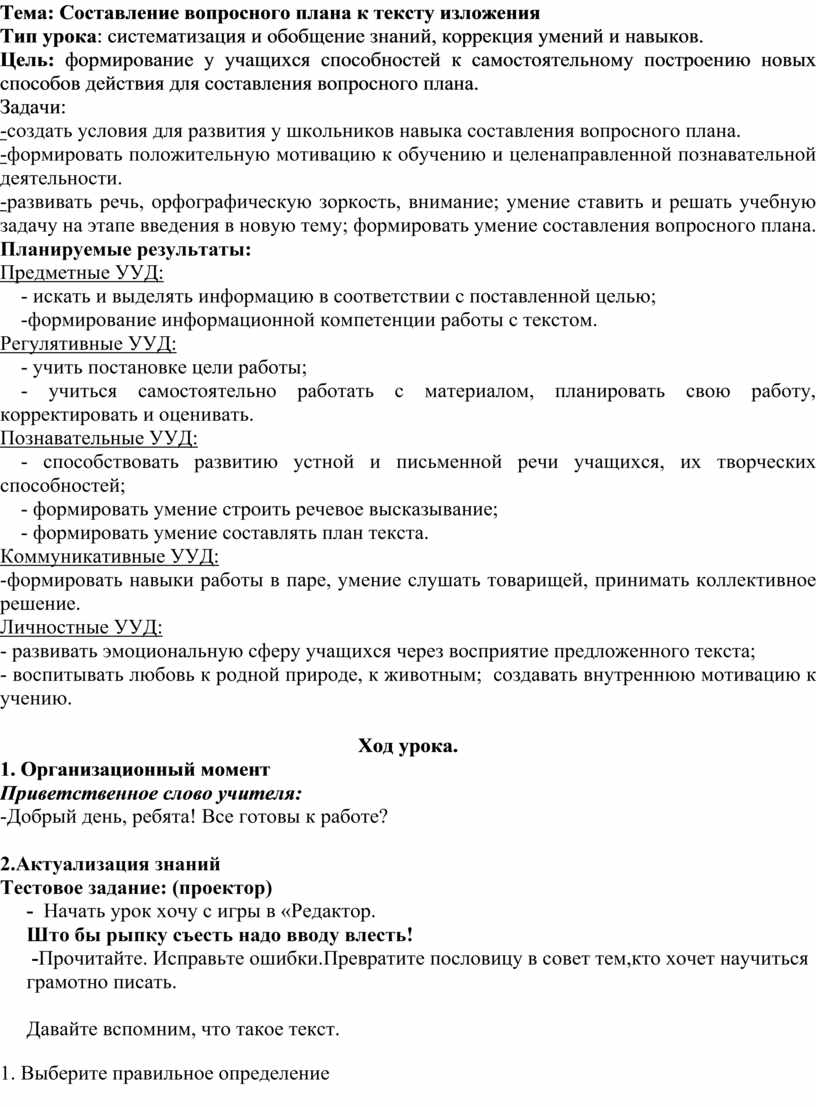 Цель: формирование у учащихся способностей к самостоятельному построению новых способов действия для составления вопросного плана.
