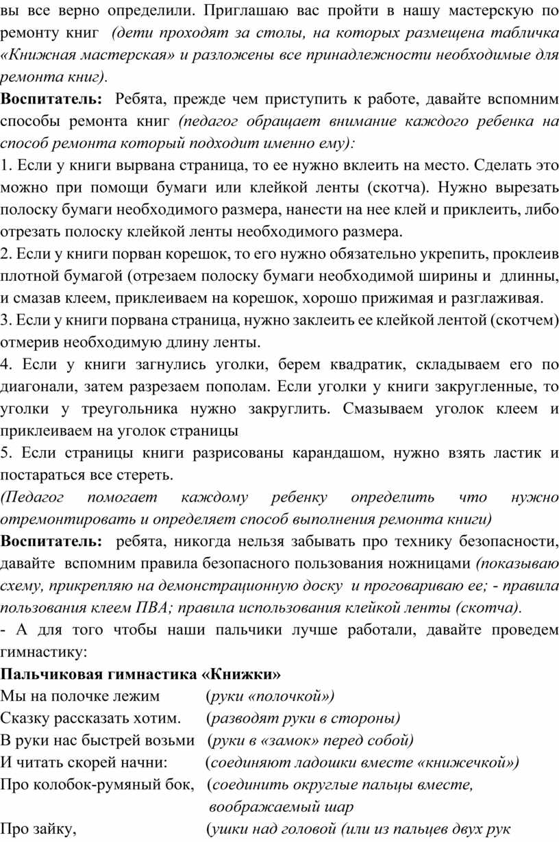 Воспитатель: Ребята, внимательно рассмотрите выбранные вами книги и определите, какая часть вашей книги нуждается в ремонте (дети рассматривают выбранные книги и высказывают свое мнение). Молодцы, вы все верно определили. Приглашаю вас пройти в нашу мастерскую по ремонту книг (дети проходят за столы, на которых размещена табличка «Книжная мастерская» и разложены все принадлежности необходимые для ремонта книг).