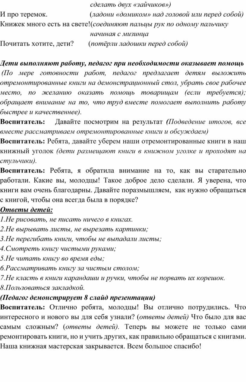 Воспитатель: Ребята, я обратила внимание на то, как вы старательно работали. Какие вы, молодцы! Такое доброе дело сделали. Я уверена, что книги вам очень благодарны. Давайте поразмышляем, как нужно обращаться с книгой, чтобы она всегда была в порядке?