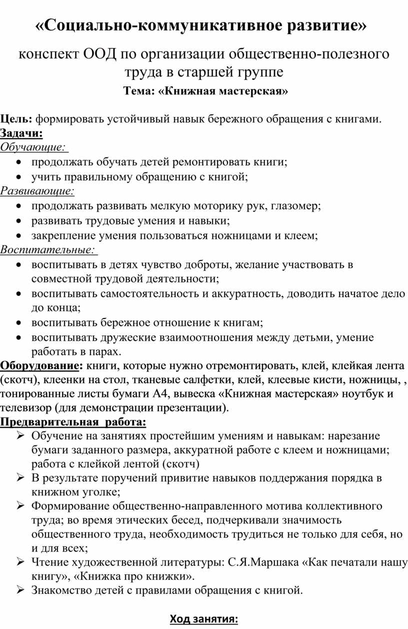 конспект ООД по организации общественно-полезного труда в старшей группе