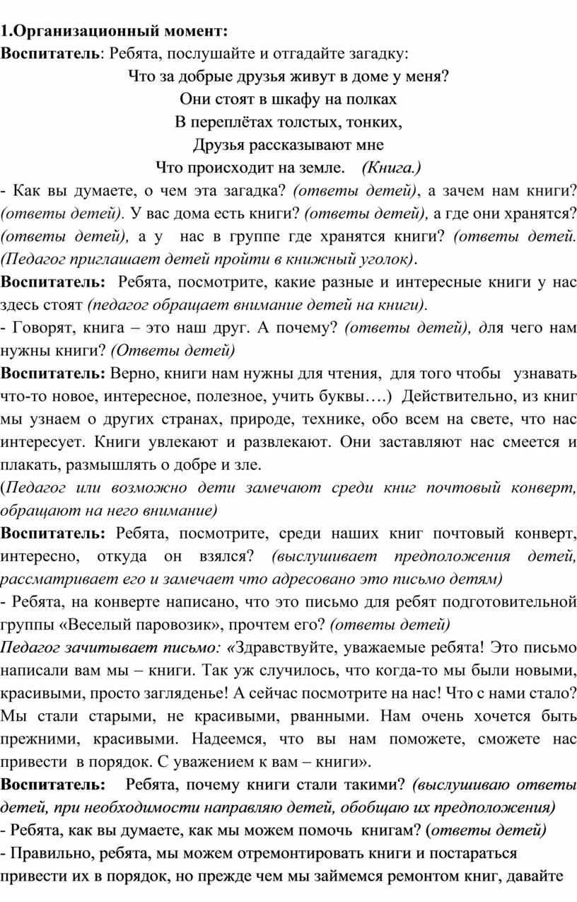 Педагог зачитывает письмо: «Здравствуйте, уважаемые ребята! Это письмо написали вам мы – книги. Так уж случилось, что когда-то мы были новыми, красивыми, просто загляденье! А сейчас посмотрите на нас! Что с нами стало? Мы стали старыми, не красивыми, рванными. Нам очень хочется быть прежними, красивыми. Надеемся, что вы нам поможете, сможете нас привести в порядок. С уважением к вам – книги».