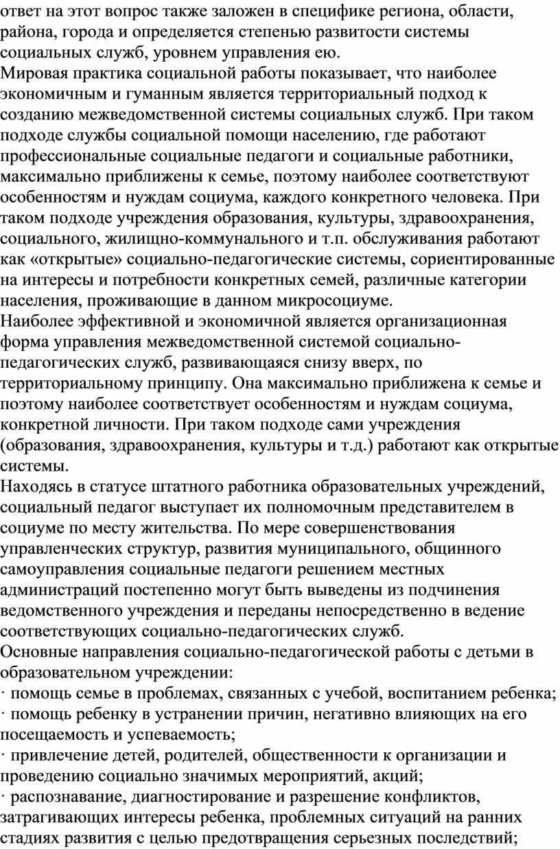 Мировая практика социальной работы показывает, что наиболее экономичным и гуманным является территориальный подход к созданию межведомственной системы социальных служб. При таком подходе службы социальной помощи населению, где работают профессиональные социальные педагоги и социальные работники, максимально приближены к семье, поэтому наиболее соответствуют особенностям и нуждам социума, каждого конкретного человека. При таком подходе учреждения образования, культуры, здравоохранения, социального, жилищно-коммунального и т.п. обслуживания работают как «открытые» социально-педагогические системы, сориентированные на интересы и потребности конкретных семей, различные категории населения, проживающие в данном микросоциуме.
