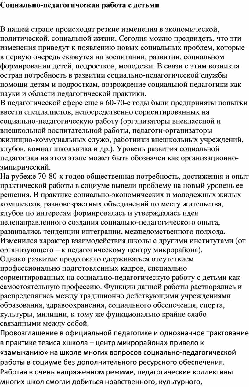 В нашей стране происходят резкие изменения в экономической, политической, социальной жизни. Сегодня можно предвидеть, что эти изменения приведут к появлению новых социальных проблем, которые в первую очередь скажутся на воспитании, развитии, социальном формировании детей, подростков, молодежи. В связи с этим возникла острая потребность в развитии социально-педагогической службы помощи детям и подросткам, возрождение социальной педагогики как науки и области педагогической практики.