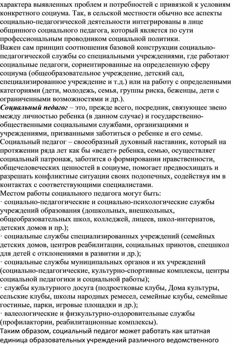 Таким образом, социальный педагог может работать как штатная единица образовательных учреждений различного ведомственного подчинения, служб социально-педагогической помощи, детских и молодежных общественных организаций, фондов. Более конкретный ответ на этот вопрос также заложен в специфике региона, области, района, города и определяется степенью развитости системы социальных служб, уровнем управления ею.