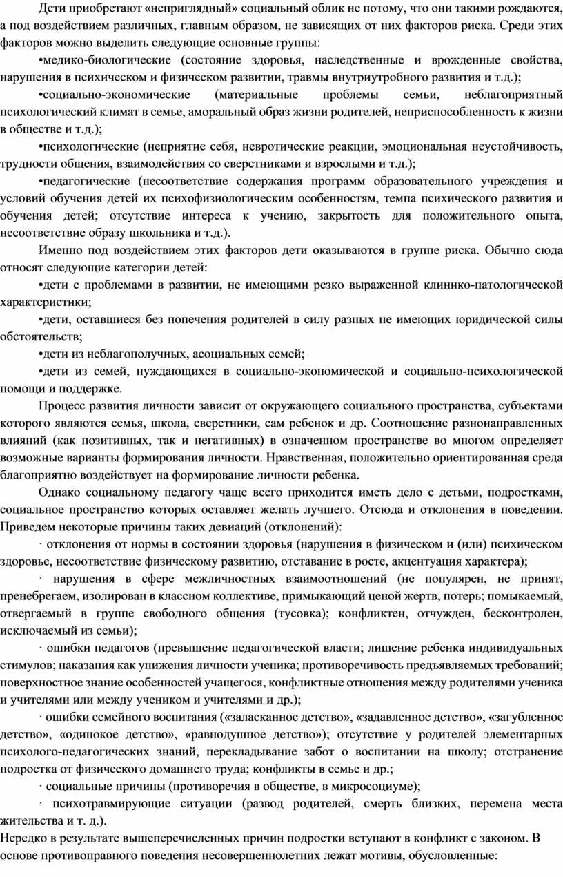 Дети приобретают «неприглядный» социальный облик не потому, что они такими рождаются, а под воздействием различных, главным образом, не зависящих от них факторов риска. Среди этих факторов можно выделить следующие основные группы: