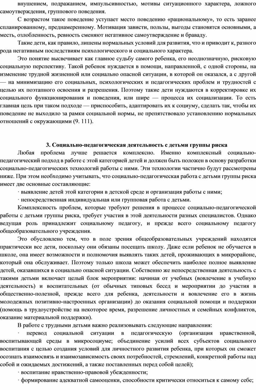 Это понятие высвечивает как главное судьбу самого ребенка, его неоднозначную, рисковую социальную перспективу. Такой ребенок нуждается в помощи, направленной, с одной стороны, на изменение трудной жизненной или социально опасной ситуации, в которой он оказался, а с другой — на минимизацию его социальных, психологических и педагогических проблем и трудностей с целью их поэтапного освоения и разрешения. Поэтому такие дети нуждаются в корректировке их социального функционирования и поведения, или шире — процесса их социализации. То есть главная цель при таком подходе — приспособить, адаптировать их к социуму, сделать так, чтобы их поведение не выходило за рамки социальной нормы, не препятствовало установлению нормальных отношений с окружающими (9. 111).