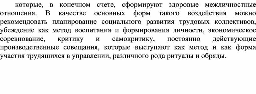 Успех деятельности руководителя зависит от того, насколько правильно применяет он различные формы социально-психологического воздействия, которые, в конечном счете, сформируют здоровые межличностные отношения. В качестве основных форм такого воздействия можно рекомендовать планирование социального развития трудовых коллективов, убеждение как метод воспитания и формирования личности, экономическое соревнование, критику и самокритику, постоянно действующие производственные совещания, которые выступают как метод и как форма участия трудящихся в управлении, различного рода ритуалы и обряды.