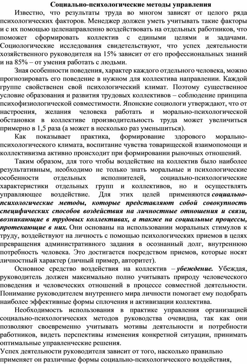 Таким образом, для того чтобы воздействие на коллектив было наиболее результативным, необходимо не только знать моральные и психологические особенности отдельных исполнителей, социально-психологические характеристики отдельных групп и коллективов, но и осуществлять управляющее воздействие. Для этих целей применяются социально-психологические методы, которые представляют собой совокупность специфических способов воздействия на личностные отношения и связи, возникающие в трудовых коллективах, а также на социальные процессы, протекающие в них. Они основаны на использовании моральных стимулов к труду, воздействуют на личность с помощью психологических приемов в целях превращения административного задания в осознанный долг, внутреннюю потребность человека. Это достигается посредством приемов, которые носят личностный характер (личный пример, авторитет).