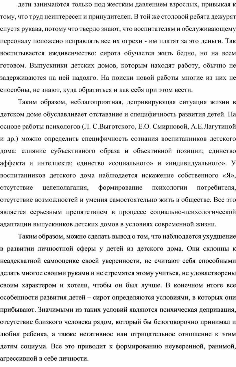 Таким образом, неблагоприятная, депривирующая ситуация жизни в детском доме обуславливает отставание и специфичность развития детей. На основе работы психологов (Л. С.Выготского, Е.О. Смирновой, А.Е.Лагутиной и др.) можно определить специфичность сознания воспитанников детского дома: слияние субъективного образа и объективной позиции; единство аффекта и интеллекта; единство «социального» и «индивидуального». У воспитанников детского дома наблюдается искажение собственного «Я», отсутствие целеполагания, формирование психологии потребителя, отсутствие возможностей и умения самостоятельно жить в обществе. Все это является серьезным препятствием в процессе социально-психологической адаптации выпускников детских домов в условиях современной жизни.