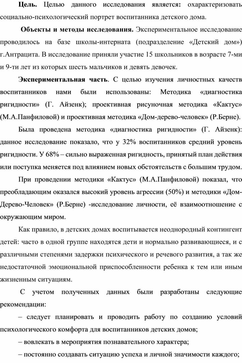 Цель. Целью данного исследования является: охарактеризовать социально-психологический портрет воспитанника детского дома.