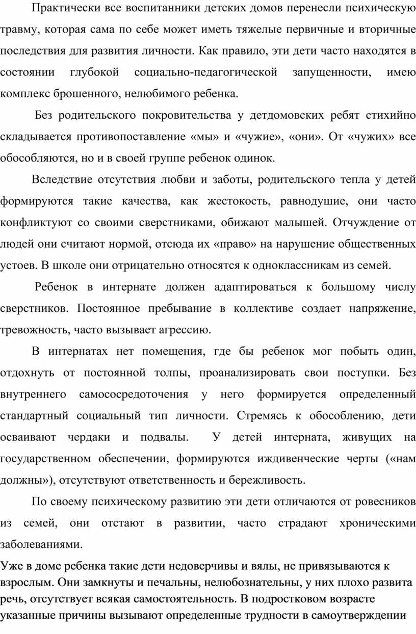 Практически все воспитанники детских домов перенесли психическую травму, которая сама по себе может иметь тяжелые первичные и вторичные последствия для развития личности. Как правило, эти дети часто находятся в состоянии глубокой социально-педагогической запущенности, имею комплекс брошенного, нелюбимого ребенка.