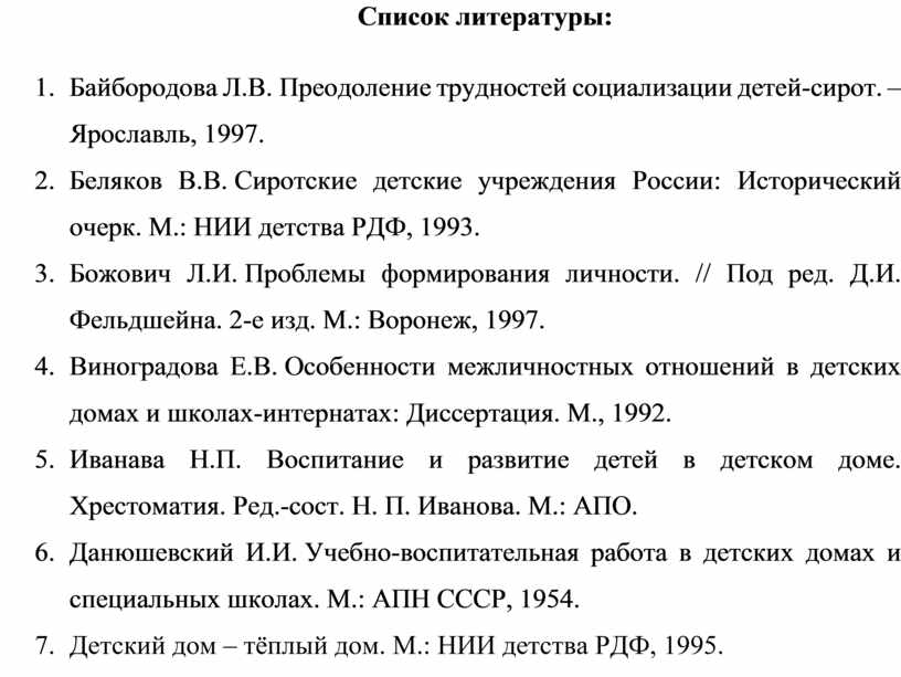 1. Байбородова Л.В. Преодоление трудностей социализации детей-сирот. – Ярославль, 1997.