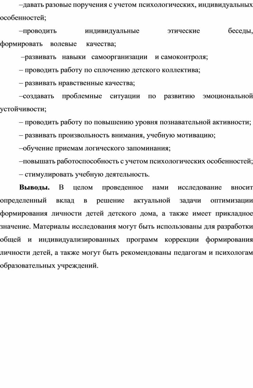 Выводы. В целом проведенное нами исследование вносит определенный вклад в решение актуальной задачи оптимизации формирования личности детей детского дома, а также имеет прикладное значение. Материалы исследования могут быть использованы для разработки общей и индивидуализированных программ коррекции формирования личности детей, а также могут быть рекомендованы педагогам и психологам образовательных учреждений.