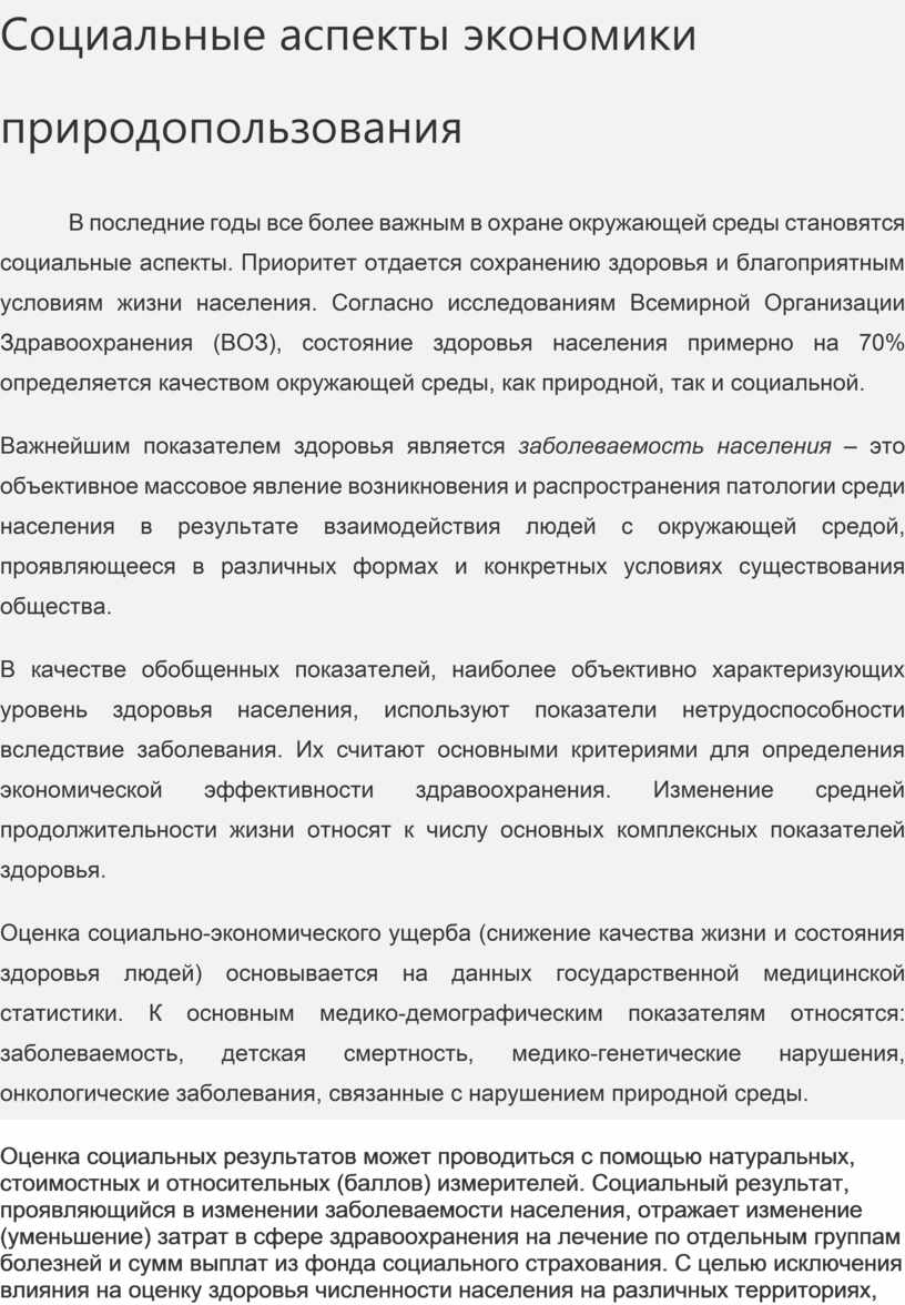 В последние годы все более важным в охране окружающей среды становятся социальные аспекты. Приоритет отдается сохранению здоровья и благоприятным условиям жизни населения. Согласно исследованиям Всемирной Организации Здравоохранения (ВОЗ), состояние здоровья населения примерно на 70% определяется качеством окружающей среды, как природной, так и социальной.