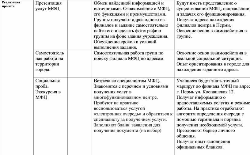 Будут иметь представление о существовании МФЦ, направлении и задачах его функционирования. Получат адреса нахождения филиалов центра в Перми. Освоение основ взаимодействия в группе.