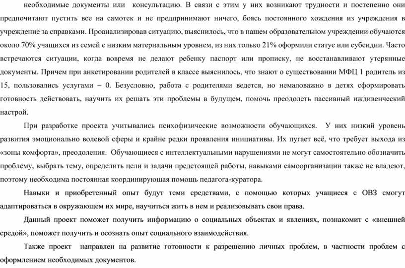 Эта тема и возраст выбраны не случайно. Достаточно часто в семьях учащихся наблюдается социальная безграмотность и беспомощность, когда даже родители не знают, куда обратиться за помощью, где получить необходимые документы или консультацию. В связи с этим у них возникают трудности и постепенно они предпочитают пустить все на самотек и не предпринимают ничего, боясь постоянного хождения из учреждения в учреждение за справками. Проанализировав ситуацию, выяснилось, что в нашем образовательном учреждении обучаются около 70% учащихся из семей с низким материальным уровнем, из них только 21% оформили статус или субсидии. Часто встречаются ситуации, когда вовремя не делают ребенку паспорт или прописку, не восстанавливают утерянные документы. Причем при анкетировании родителей в классе выяснилось, что знают о существовании МФЦ 1 родитель из 15, пользовались услугами – 0. Безусловно, работа с родителями ведется, но немаловажно в детях сформировать готовность действовать, научить их решать эти проблемы в будущем, помочь преодолеть пассивный иждивенческий настрой.