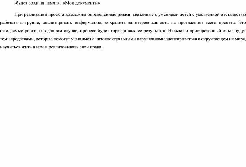 При реализации проекта возможны определенные риски, связанные с умениями детей с умственной отсталостью работать в группе, анализировать информацию, сохранить заинтересованность на протяжении всего проекта. Это ожидаемые риски, и в данном случае, процесс будет гораздо важнее результата. Навыки и приобретенный опыт будут теми средствами, которые помогут учащимся с интеллектуальными нарушениями адаптироваться в окружающем их мире, научиться жить в нем и реализовывать свои права.