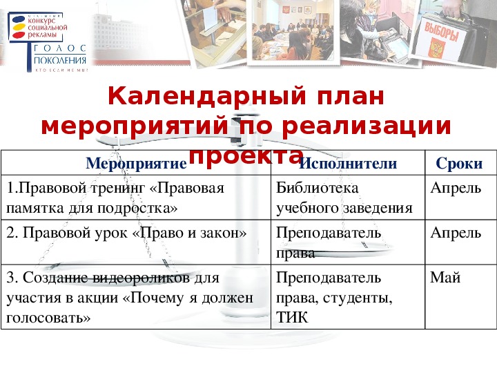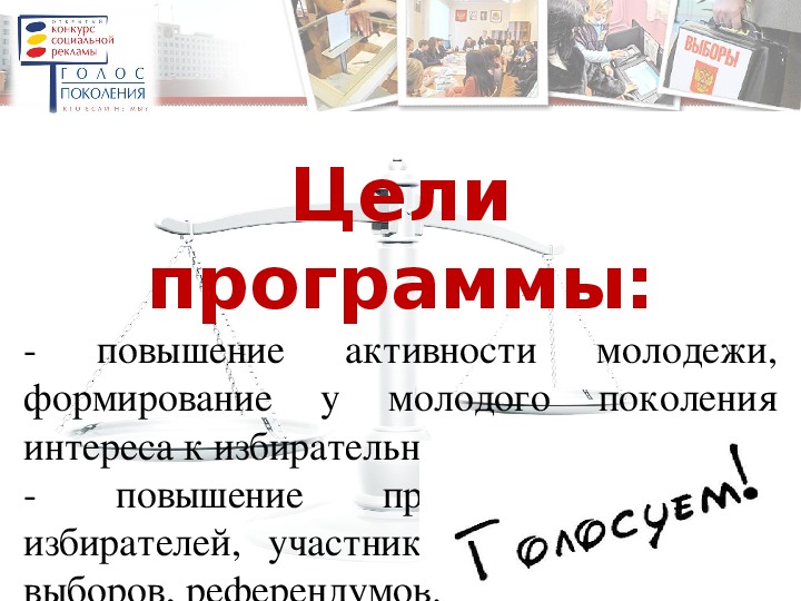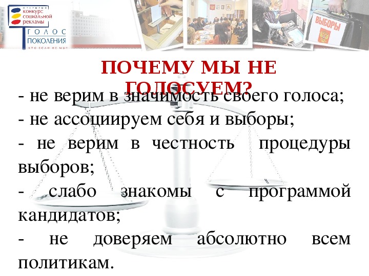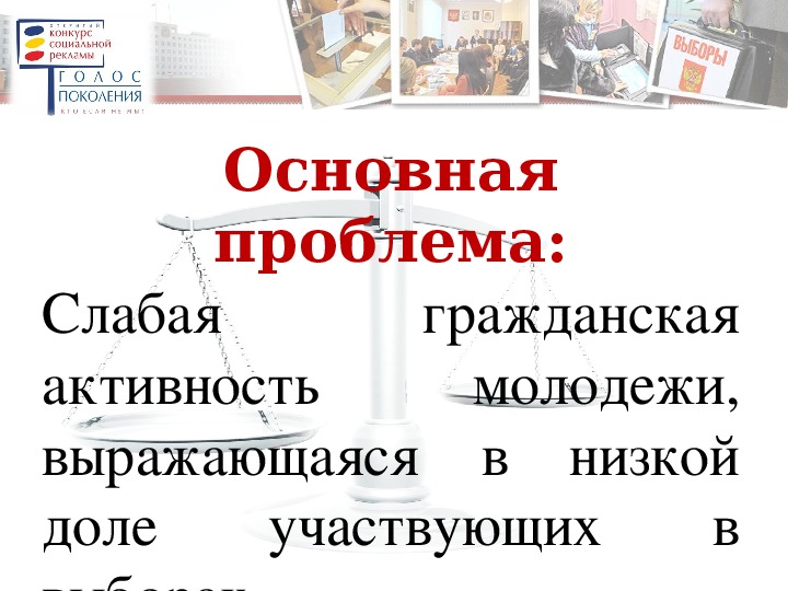 Основная проблема: слабая гражданская активность молодежи, выражающаяся в низкой доле участвующих в выборах. Проект нацелен на изменение мышления молодежи, с целью привлечения к участию в выборах.
