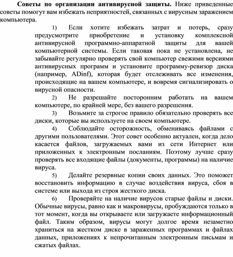 Советы по организации антивирусной защиты. Ниже приведенные советы помогут вам избежать неприятностей, связанных с вирусным заражением компьютера.