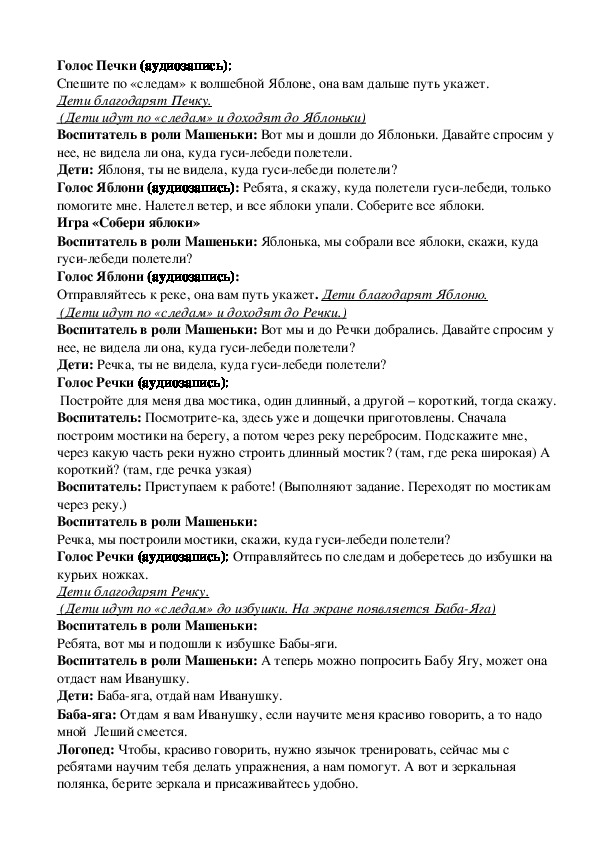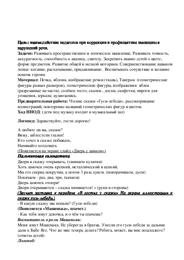 «По следам сказки «Гуси-лебеди". Цель: взаимодействие педагогов при коррекции и профилактике имеющихся нарушений речи. Задачи: Развивать пространственное и логическое мышление. Развивать точность, аккуратность, способность к анализу, синтезу. Закрепить знание детей о цвете, форме предметов. Развитие общей и мелкой моторики. Совершенствование навыков лепки: катание, раскатывание, придавливание. Воспитывать сочувствие и желание помочь героям.