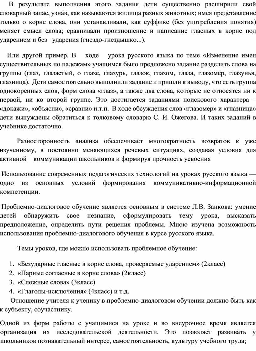 Проблемно-диалоговое обучение является основным в системе Л.В. Занкова: умение детей обнаружить свое незнание, сформулировать тему урока, высказать предположение, определить пути решения проблемы. Мною изучена возможность использования проблемно-диалогового обучения в курсе русского языка.