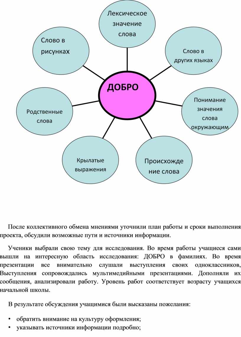 После коллективного обмена мнениями уточнили план работы и сроки выполнения проекта, обсудили возможные пути и источники информации.