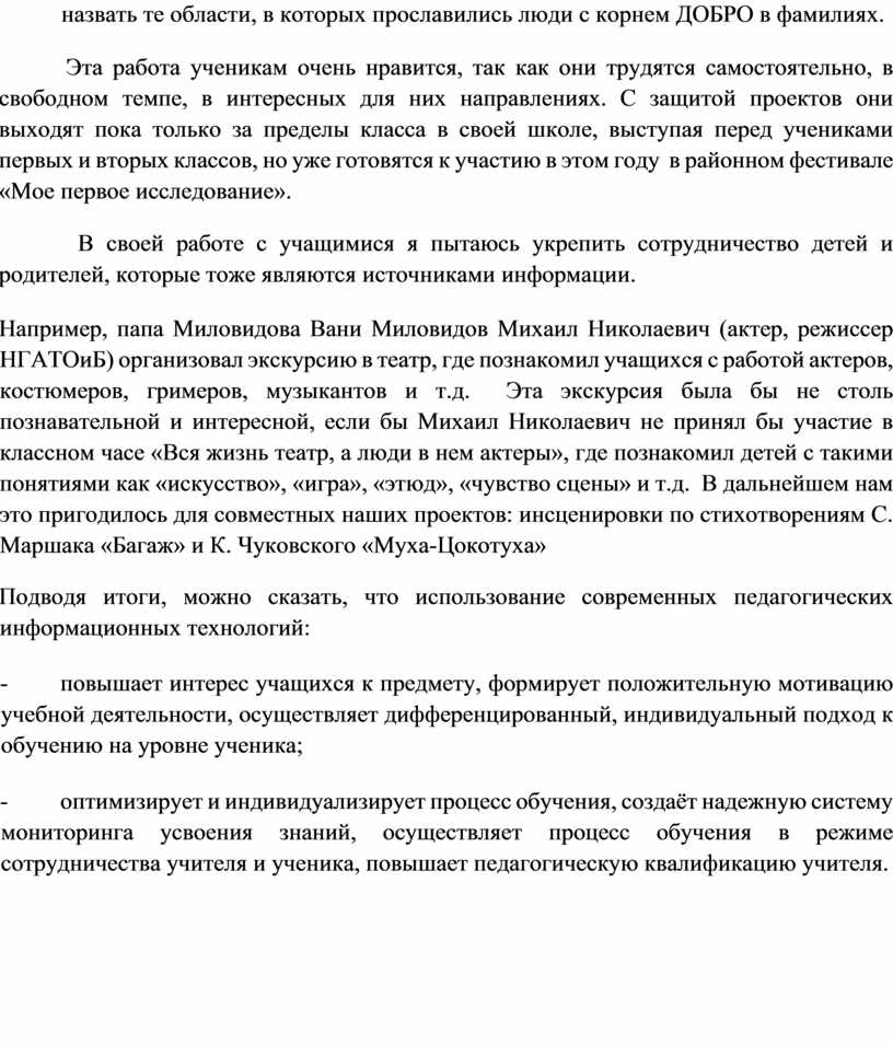Ученики выбрали свою тему для исследования. Во время работы учащиеся сами вышли на интересную область исследования: ДОБРО в фамилиях. Во время презентации все внимательно слушали выступления своих одноклассников, Выступления сопровождались мультимедийными презентациями. Дополняли их сообщения, анализировали работу. Уровень работ соответствует возрасту учащихся начальной школы.
