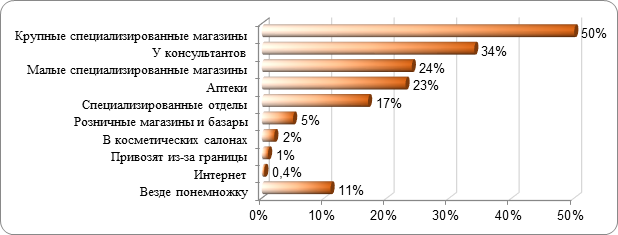 Места покупки косметики в Республике Казахстан. Источник: на основе анализа DAMU RG и данных маркетингового агентства «GOOD».