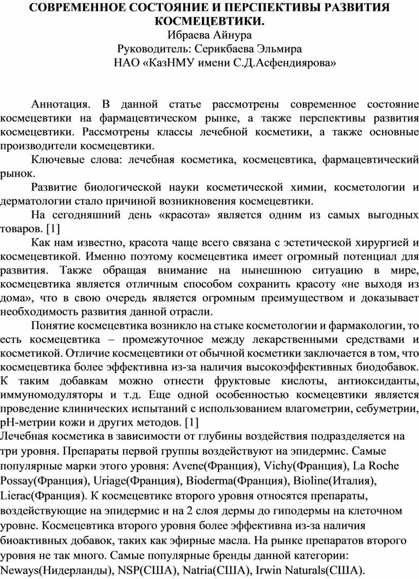 СОВРЕМЕННОЕ СОСТОЯНИЕ И ПЕРСПЕКТИВЫ РАЗВИТИЯ КОСМЕЦЕВТИКИ.