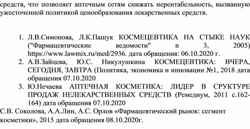 4. С.В. Соколова, А.А.Лин, А.С. Орлов «Фармацевтический рынок: сегмент косметики», 2015 дата обращения 08.10.2020г.