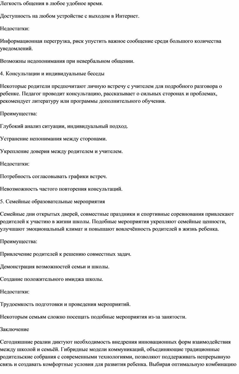Сегодняшние реалии диктуют необходимость внедрения инновационных форм взаимодействия между школой и семьёй. Гибридные модели коммуникаций, объединяющие традиционные родительские собрания с современными технологиями, позволяют поддерживать непрерывную связь и создавать комфортные условия для развития ребенка. Выбирая оптимальную комбинацию инструментов, педагоги и родители добиваются значимых результатов в образовании и воспитании подрастающего поколения.
