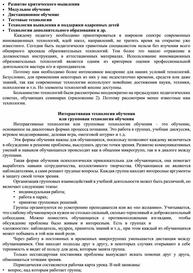 Большинство технологий были рассмотрены неоднократно на предыдущих педагогических советах, обучающих семинарах (приложение 2). Поэтому рассмотрим менее известные нам технологии.