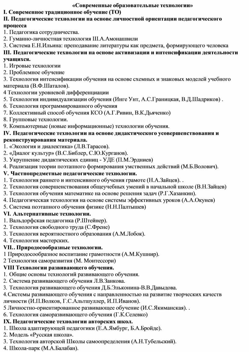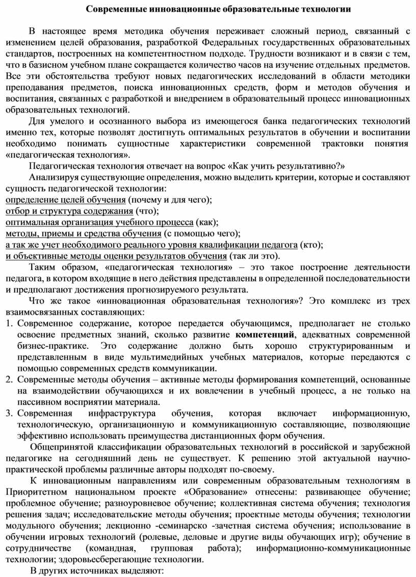 К инновационным направлениям или современным образовательным технологиям в Приоритетном национальном проекте «Образование» отнесены: развивающее обучение; проблемное обучение; разноуровневое обучение; коллективная система обучения; технология решения задач; исследовательские методы обучения; проектные методы обучения; технологии модульного обучения; лекционно -семинарско -зачетная система обучения; использование в обучении игровых технологий (ролевые, деловые и другие виды обучающих игр); обучение в сотрудничестве (командная, групповая работа); информационно-коммуникационные технологии; здоровьесберегающие технологии.