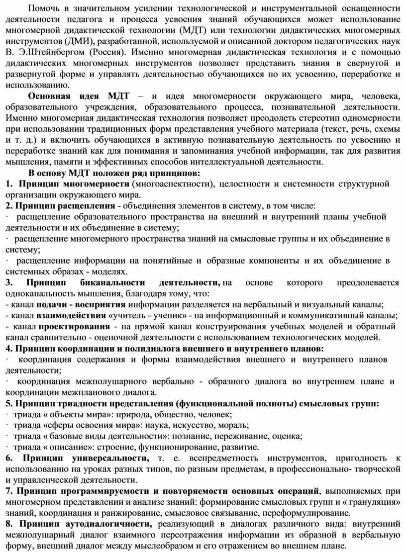 Помочь в значительном усилении технологической и инструментальной оснащенности деятельности педагога и процесса усвоения знаний обучающихся может использование многомерной дидактической технологии (МДТ) или технологии дидактических многомерных инструментов (ДМИ), разработанной, используемой и описанной доктором педагогических наук В. Э.Штейнбергом (Россия). Именно многомерная дидактическая технология и с помощью дидактических многомерных инструментов позволяет представить знания в свернутой и развернутой форме и управлять деятельностью обучающихся по их усвоению, переработке и использованию.
