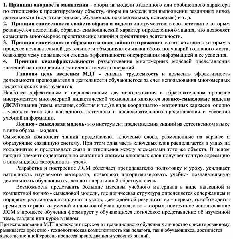 Основная идея МДТ – и идея многомерности окружающего мира, человека, образовательного учреждения, образовательного процесса, познавательной деятельности. Именно многомерная дидактическая технология позволяет преодолеть стереотип одномерности при использовании традиционных форм представления учебного материала (текст, речь, схемы и т. д.) и включить обучающихся в активную познавательную деятельность по усвоению и переработке знаний как для понимания и запоминания учебной информации, так для развития мышления, памяти и эффективных способов интеллектуальной деятельности.