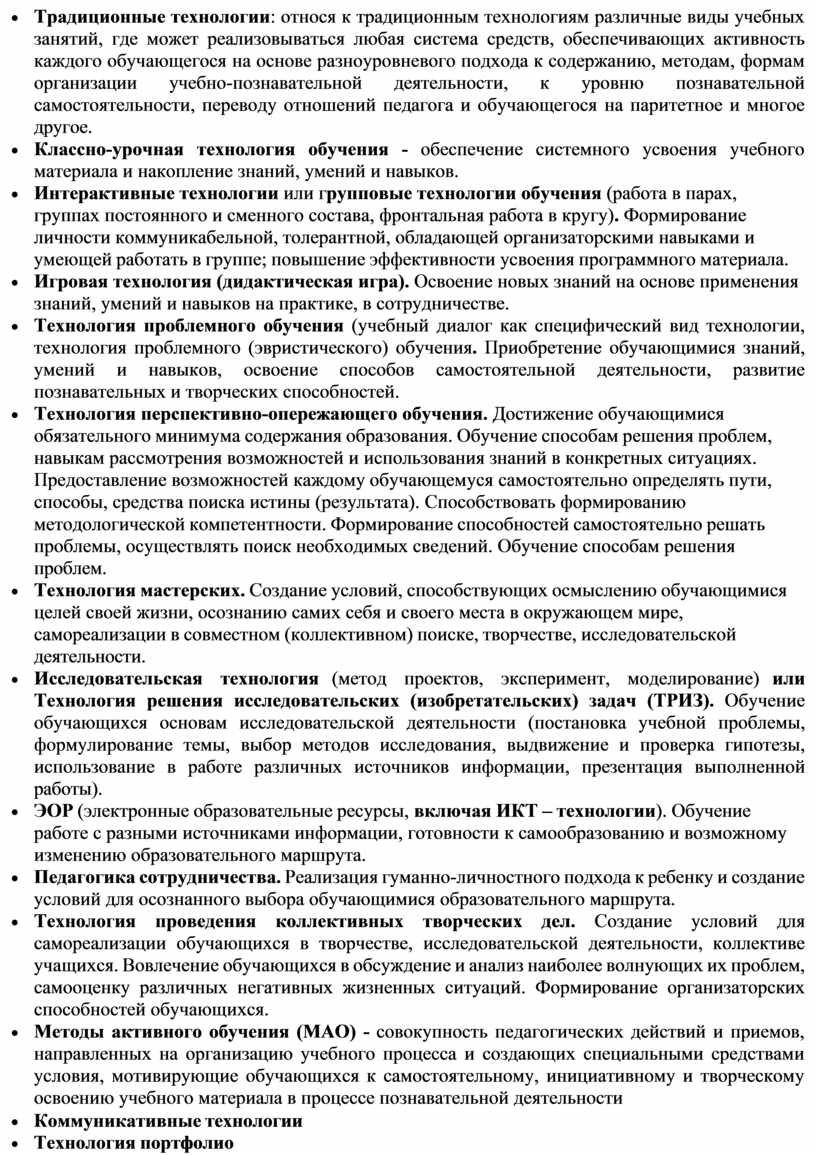 · Традиционные технологии: относя к традиционным технологиям различные виды учебных занятий, где может реализовываться любая система средств, обеспечивающих активность каждого обучающегося на основе разноуровневого подхода к содержанию, методам, формам организации учебно-познавательной деятельности, к уровню познавательной самостоятельности, переводу отношений педагога и обучающегося на паритетное и многое другое.