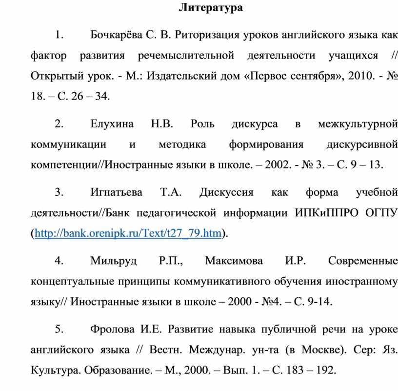 5. Фролова И.Е. Развитие навыка публичной речи на уроке английского языка // Вестн. Междунар. ун-та (в Москве). Сер: Яз. Культура. Образование. – М., 2000. – Вып. 1. – С. 183 – 192.