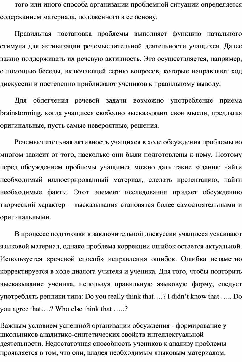 Обсуждение проблемы на уроке позволяет активизировать иноязычную речевую деятельность учащихся, повышает роль уроков иностранного языка в интеллектуальном развитии школьников, усиливает воспитательное значение предмета.