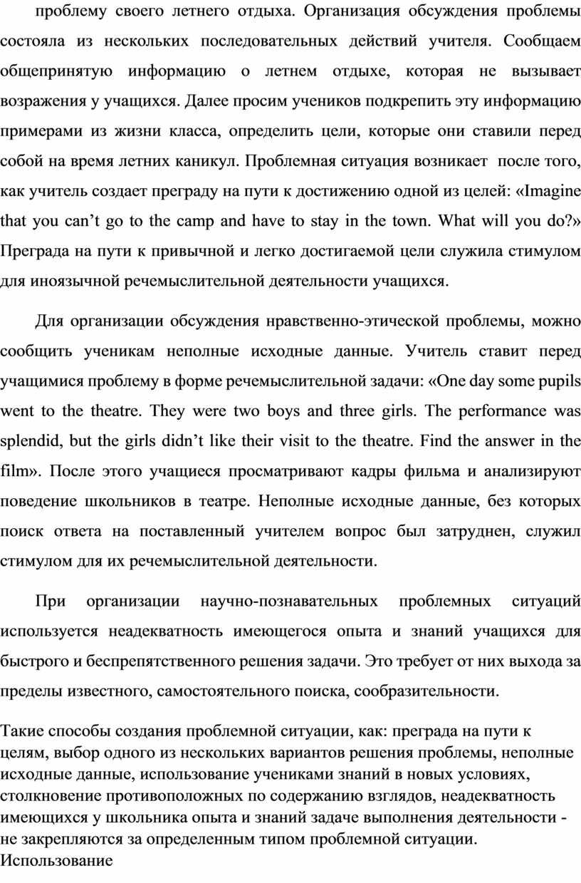 Для организации обсуждения проблемы поведенческого типа создаются преграды на пути к цели. Например, на одном из уроков учащиеся обсуждали проблему своего летнего отдыха. Организация обсуждения проблемы состояла из нескольких последовательных действий учителя. Сообщаем общепринятую информацию о летнем отдыхе, которая не вызывает возражения у учащихся. Далее просим учеников подкрепить эту информацию примерами из жизни класса, определить цели, которые они ставили перед собой на время летних каникул. Проблемная ситуация возникает после того, как учитель создает преграду на пути к достижению одной из целей: «Imagine that you can’t go to the camp and have to stay in the town. What will you do?» Преграда на пути к привычной и легко достигаемой цели служила стимулом для иноязычной речемыслительной деятельности учащихся.