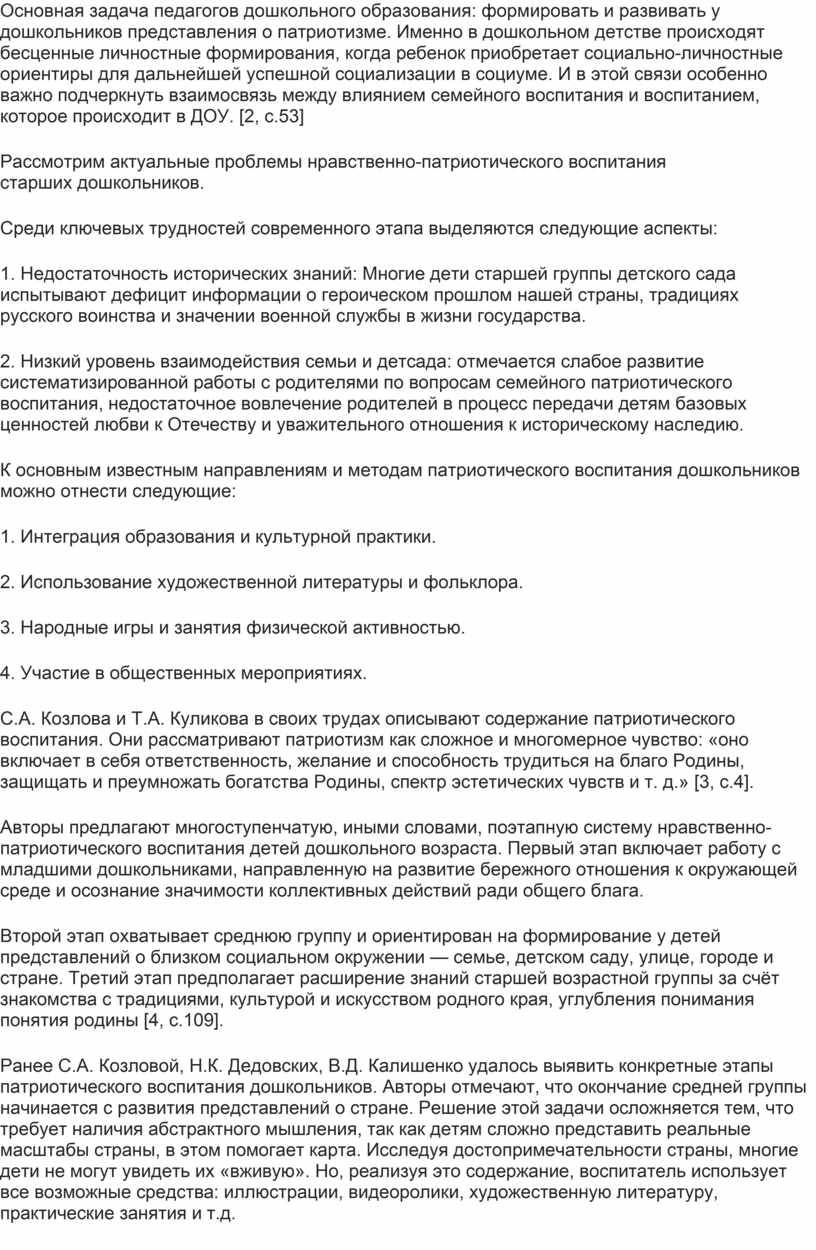 Основная задача педагогов дошкольного образования: формировать и развивать у дошкольников представления о патриотизме. Именно в дошкольном детстве происходят бесценные личностные формирования, когда ребенок приобретает социально-личностные ориентиры для дальнейшей успешной социализации в социуме. И в этой связи особенно важно подчеркнуть взаимосвязь между влиянием семейного воспитания и воспитанием, которое происходит в ДОУ. [2, с.53]